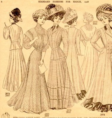 By 1900, the bustle and crinoline had been abandoned and the gored skirt became popular, flaring out from a small waist. Though corsets were still worn, they were redesigned to remove pressure from the abdomen and created an S-shaped curve. Bodices were tight as the decade began but the puffed “pigeon” look soon became popular and a loose poufy bodice emerged to enhance the narrow waists. The large sleeves that had exaggerated the hourglass shape in the nineties began to shrink in volume so that they were loosely puffed at the bottom or rounded only at the shoulder area. As the decade continued, skirts rose from floor-length to ankle-length and the start of the flare began lower, moving from the hip to the knee and hugging the body more tightly around curves. Waistlines were lower and often emphasized with wide sashes or waistbands. For working women, especially, the shirt-waist became popular—a white bodice modeled on the male shirt—worn with a gored skirt. Tailor-mades (mass-produced ankle-length skirts and matching jackets) were also worn. Sports-wear, designed for ease of movement, drove the trend of shorter skirt lengths. “Haute couture” emerged with designer-influenced dresses, often with higher waists, shorter skirts, and long tunic like jackets worn over new “straight line” corsets that abandoned the S-shape for a straight, less-curved silhouette.