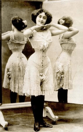 The undergarments that accommodated the fashion changes went through radical changes. Corsets came in never-ending variety. The S-bend corsets are the most-remembered, their longer (bust to hip) construction giving women a flat front and extended derrieres. There were also waist-corsets, some of which tucked in the waist only and hip-protectors, which sat below the waist to shape the hips. These lower corsets were worn with bust improvers—the forerunner of the bra. Camisoles and knickers were common as was the new “combination” or “teddy.” During the latter part of the decade, corsets came to look more like the girdles that would follow when elastic replaced boning. Petticoats narrowed and shortened to knee-length. Fabrics also changed, from basic cotton to nainsook, lawn, silk and satin as less became more.