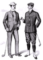Winter coats were knee or calf-length. Shoes were usually over the ankle boots; white uppers (or spats) might be added for formal occasions. Lace-up oxford shoes were also introduced during the Edwardian era. For rugged outdoor activities, the tweed Norfolk jacket was worn, with box pleats in front and back and a cloth belt. With matching knickerbockers and knee-length stockings, it was suitable for bicycling or golf. Bathing costumes were two-piece with knee-length cotton or wool drawers and a long top.