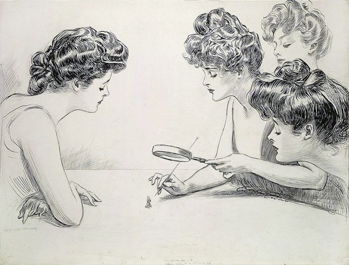 But it wasn’t the “look” alone that made the Gibson Girl so popular. Gibson set his subjects into illustrations that conveyed attitude and personality. She was always clad in the latest fashion, often shown in athletic situations. Illustrations depicted her as calm, intelligent, and confident. She might be shown in the workplace or attending college, suggestive of the New Woman who sought her way in the world independent of men. Yet, Gibson never showed his subjects campaigning for the vote. In short, she represented women who stretched the boundaries without threatening the balance of politics. She might be teasing, confident in her role as a woman, even dominant (see illustration of Gibson Girls examining comical little men under a magnifying glass). When men were not reduced to simpletons by her beauty and confidence, they appeared adoring. The Gibson Girl was most often depicted as single and carefree but when shown in relationship illustrations, she appeared happy (if allowed to maintain her independence) as a wife and devoted as a mother. She both stretched cultural boundaries and represented admired ideals.