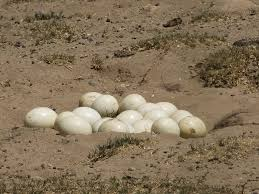 Ostrich eggs are laid in a common nest—a shallow depression up to nine feet in diameter—with the main hen laying hers in the center for greatest chance of survival. The alpha male and dominant female take turns incubating all of the eggs. The female takes the day shift when her drab coloring blends in with the ground while he takes sits at night when his black feathers match the darkness. The eggs average six inches long, five inches across, and weigh about three pounds. A hen lays seven to ten eggs at a time. The average ostrich can incubate a dozen or more at a time. Eggs hatch about 35 to 45 days after being laid.
