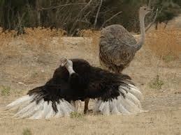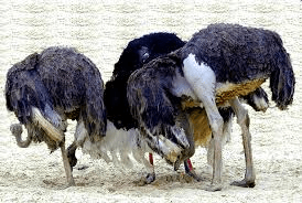 And what about ostriches burying their heads in the sand? Not true! The myth arose from the bird’s defensive actions. If running is not an option, an ostrich will flop to the ground, and stretch its head and neck flat on the ground. Because their coloring blends with the sandy soil, it appears their head is buried in the sand.