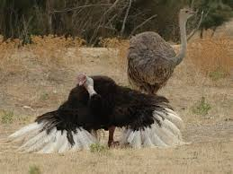 Herds are dominated by alpha males (roosters or cocks) and groups of two to seven females (hens). The males mate with the dominant female (main hen) in the group, sometimes with others. Lesser hens are also mated by wandering males outside of the herd. Dominance is relayed by a proud stance, with head up, and lifting of the wings and tail feathers. Submission is shown by the drooping of head, wings, and tail. Fights among males for dominance usually last a few minutes but can result in severe injury or death as a result of head slams.