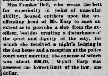 Working on the police force seemed to be a good fit for Wyatt Earp. By all accounts (as evidenced by newspaper reports), he handled himself well and was respected. He was known for his even temper on the job—a temper that got out of hand when he was not working. Wyatt was arrested for a fight with Bill Smith (appointed city marshal in 1874). Smith did not hold with the prior marshal’s policy of routinely fining brothels and began a campaign to raid and shut down as many as possible. The justice of the peace and city attorney at the time agreed with him.